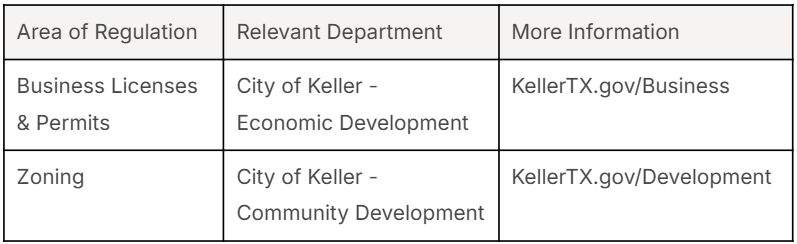 The City of Keller's Economic Development Department can provide useful resources and help you with these first steps!